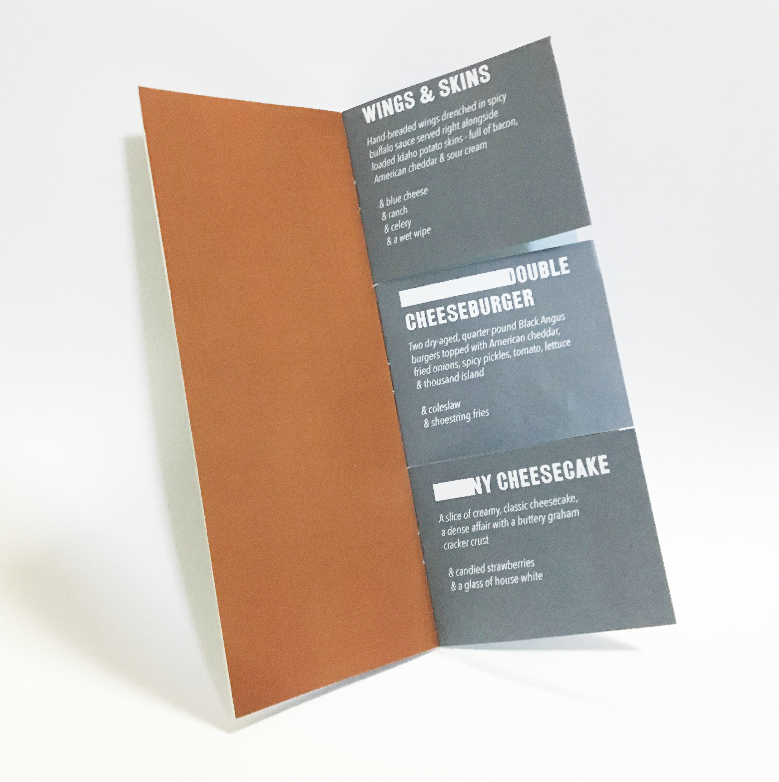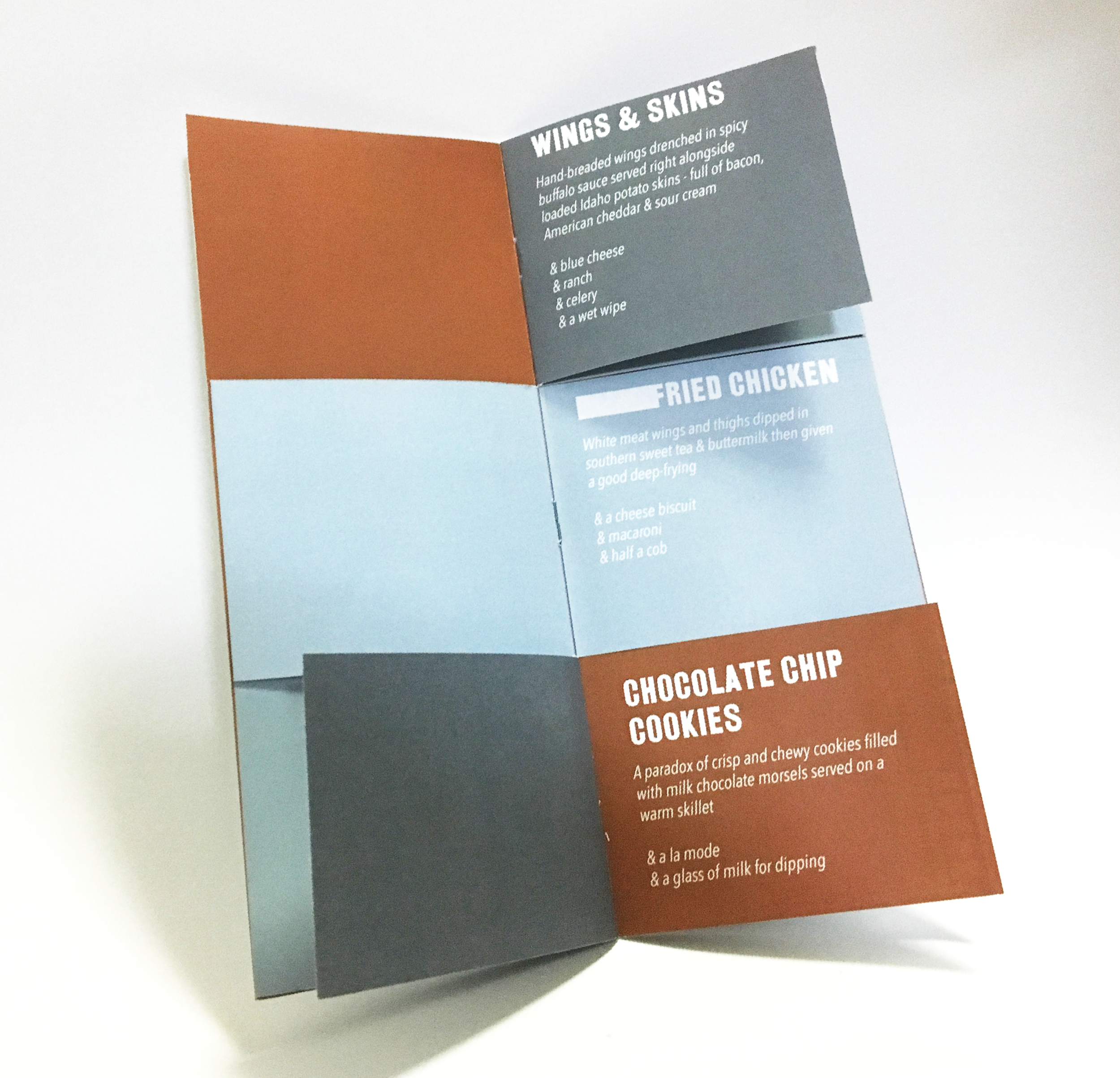 Seasonal tasting menu design. As opposed to the usual listed menu, the guest is able to flip through, mixing and matching options to their desires.