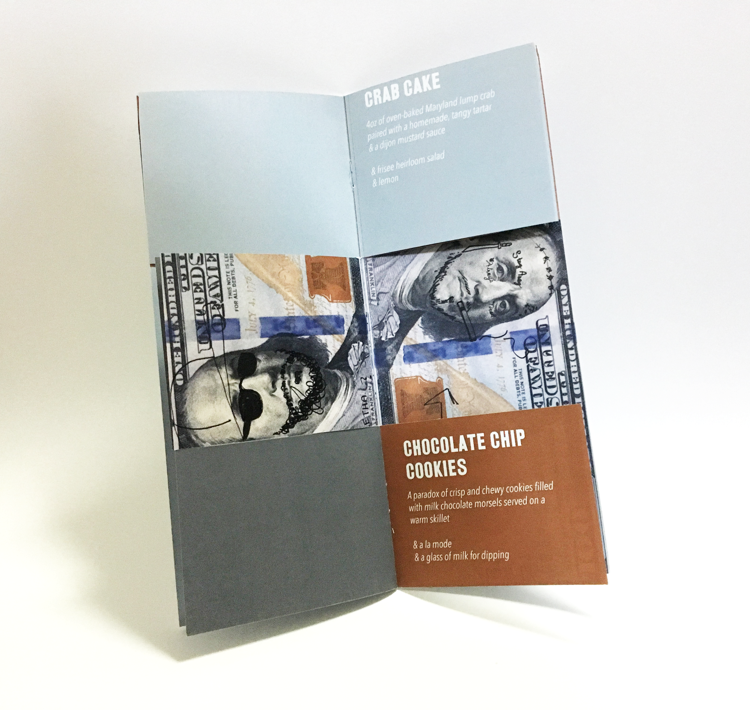 Completed menu mockup featuring the Benjamins as cover pages. Extended stem type treatment consistent with logo type.